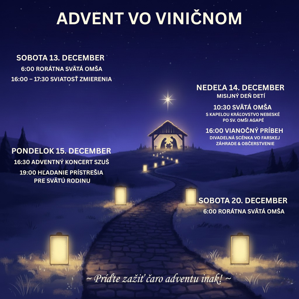 Vo farskej záhrade v nedeľu o 16 h si deti pripravili krátku divadelnú scénku, Vianočný príbeh. Bude aj občerstvenie sa navzájom z nášho stola a teplé nápoje.